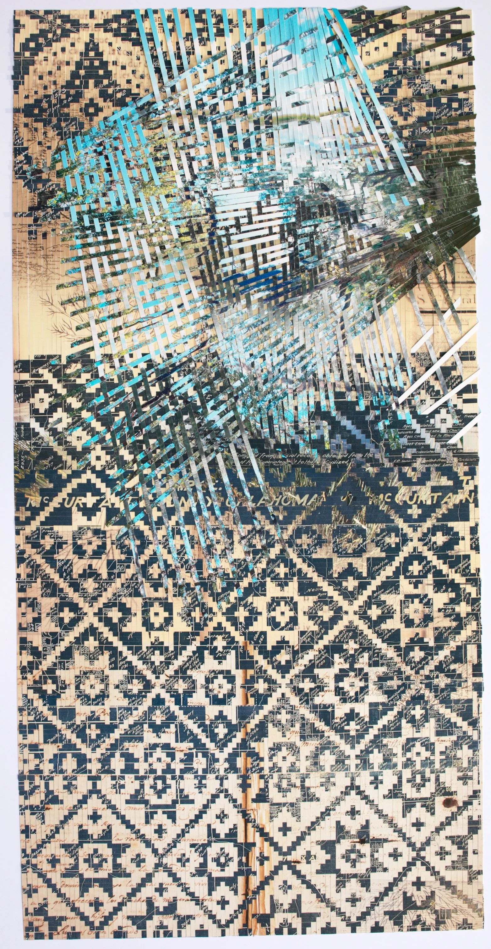 Sarah Sense (Chitimacha/Choctaw, born 1980), Hinushi 9, 2023, woven archival inkjet prints on Hahnemühle bamboo paper and Hahnemühle rice paper, beeswax, and tape, 79 1/2 × 40 inches. Portland Museum of Art, Maine. Museum purchase with support from Friends of the Collection, 2025.1.
