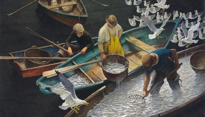 top image: Newell Convers Wyeth (United States, 1882–1945), “Dark Harbor Fishermen” (detail), 1943, tempera on hardboard (Renaissance Panel). Bequest of Elizabeth B. Noyce, 1996.38.63.