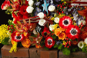 JS: Armed with a color palette and a budget, I made my way to the New England Flower Exchange, searching for flowers with the right colors and shape to meet my design. I tend to shop improvisationally and never quite know what my elements are going to be ahead of time. My response to Ghetto Wall #2 also had me looking for bricks and black fabric to complete the composition.