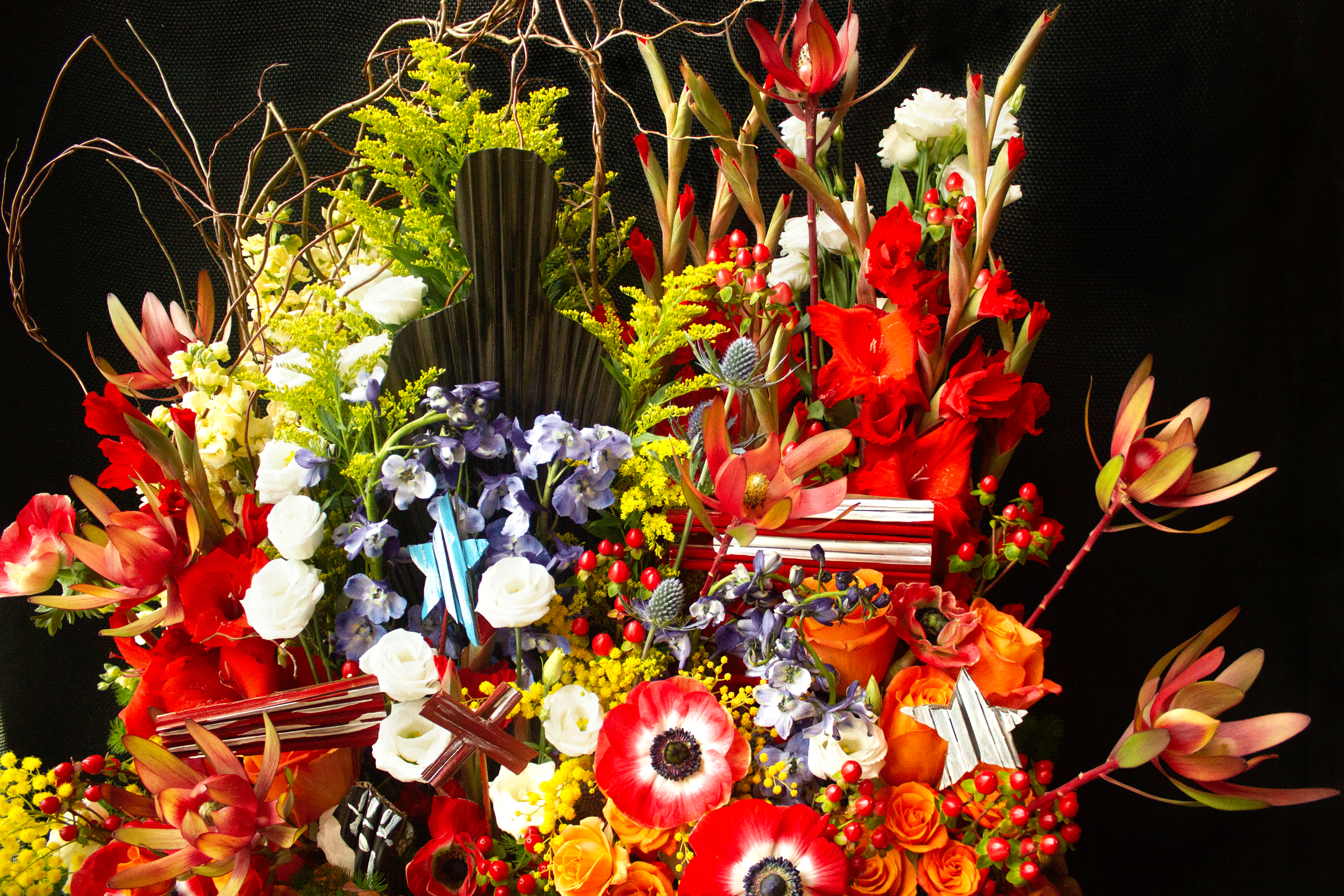 JS: I chose the flowers primarily for their color, quality, and overall shape. The background is red and orange gladiola, mustard curly willow, yellow solidago, orange roses, cream stock, and blue delphinium. I created the silhouette and graphic elements from large, dried palm leaves. Bringing in texture and interest are blue sea holly, red hypericum berry, yellow mimosa acacia, green ming fern, white lisianthus, and orange spray roses. I finished with red leucadendron and the stunning red and white anemone with dark blue centers.