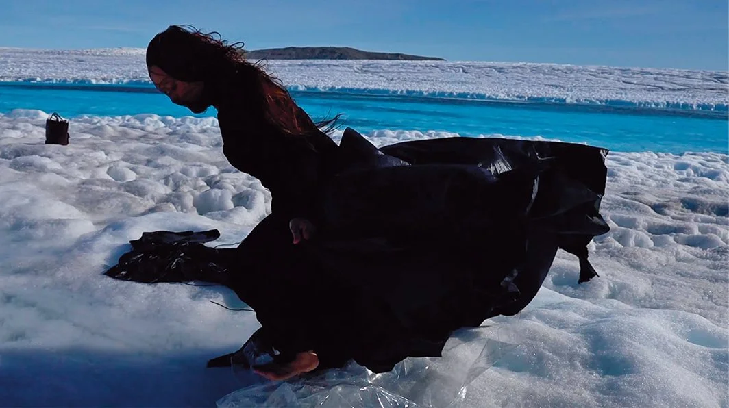 Yet a handful of artists—particularly those working in video and performance—pushed the exhibition’s thematics into stranger and more compelling territory. In Greenlander Jessie Kleemann’s performance Arkhticós Doloros (The Arctic in Pain), 2019, re-presented via single-channel video, the artist staged a series of actions—wrapping herself with a tarp, binding her face with a rope, rubbing her hair in meltwater—on the remote Sermeq Kujalleq glacier. A powerful wind whips through the scene, overwhelming the mics and shaking the cameras; the work also captures the massive crew the artist needed to reach the glacier. At the end of the piece, we see the artist packing up her props and boarding a helicopter to return home. Kleemann’s performance, simultaneously ritualistic, improvisational, doleful, and absurdist, is a sharp contrast to the brutal conditions of the location, and offers little in the way of solace or catharsis.
