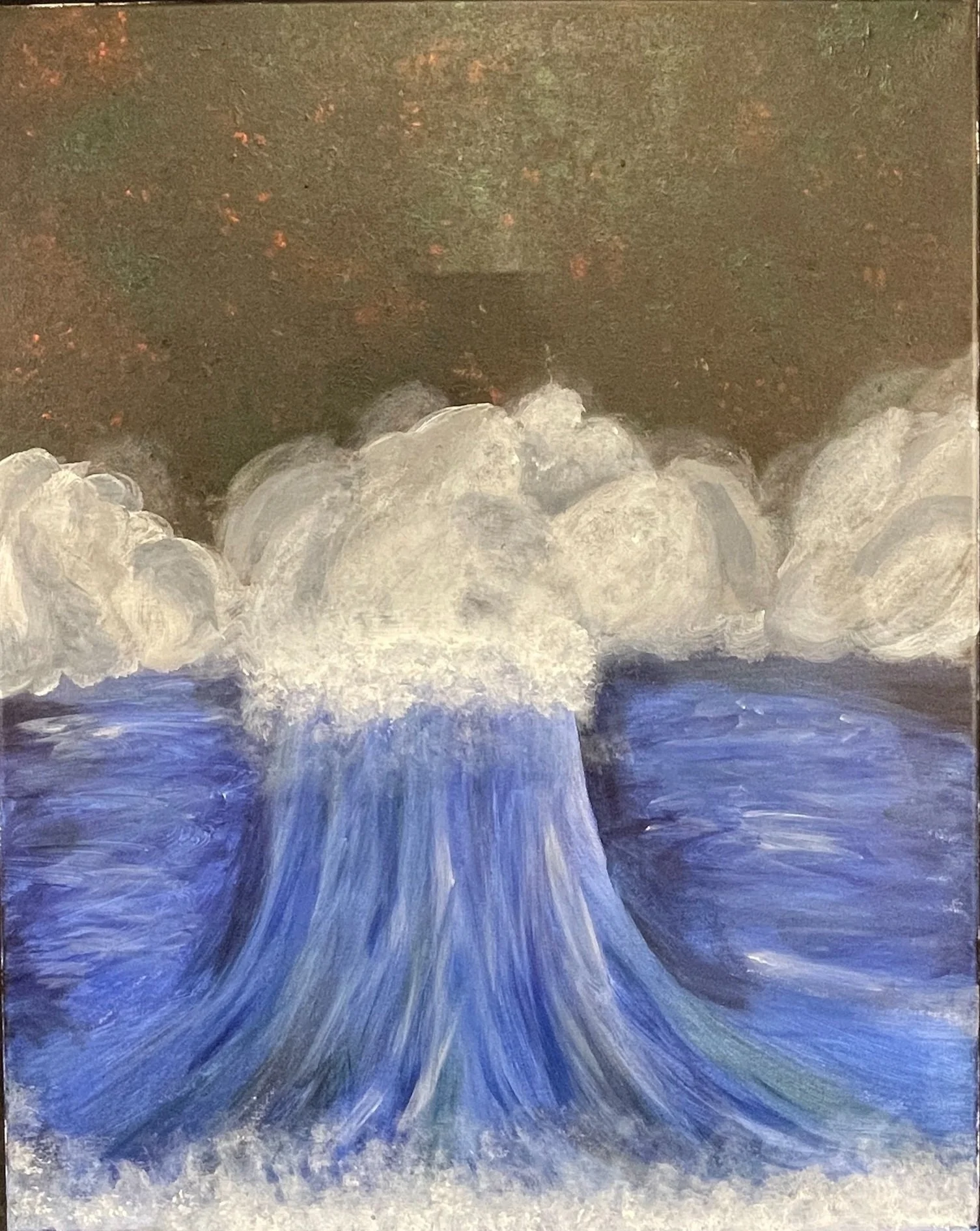 “My artwork is an acrylic painting with the colors black, green, red, white and blue. At the top of the painting it’s dark with splotches of dark red and green. In the middle their are fluffy clouds, and pouring from the clouds is a body of water with streaks of blue and green. This piece was created during class while listening to Vivaldi’s Winter. While listening to the music I began to envision a storm and as the music began to play it mellowed out. My overall thoughts on this piece is that I learned how music can help artist develop emotions to create art. I don’t believe this piece will affect my future artwork because I typically have my go to artistic styles and themes. The method of creating art is unusual for me to use.”