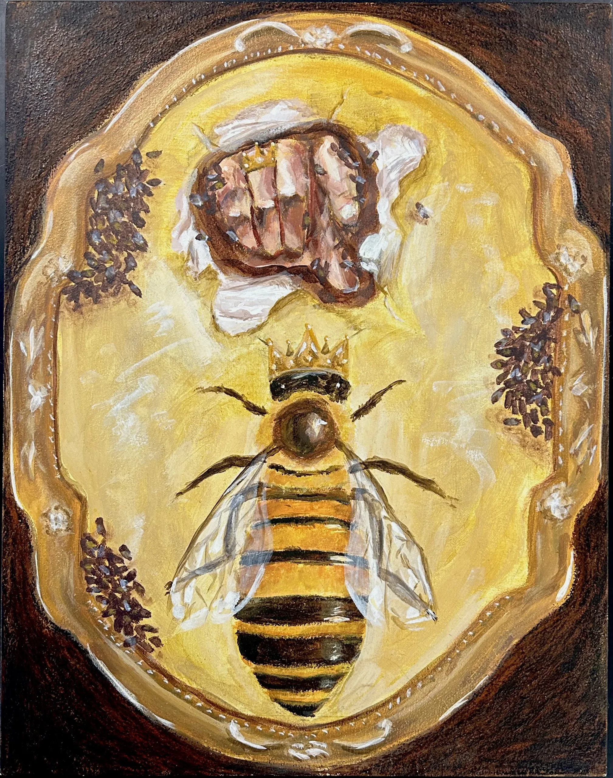 “My piece is exploring why we (people) deem insects as gross and ugly despite their natural abundance and necessity. Specifically, thinking insects aren’t deserving of something as luxurious and beautiful as a crown. I used acrylic paint and beeswax crayons on board; the crayons felt like a natural medium to use, symbolizing how we can live harmoniously with the subject of my piece.”