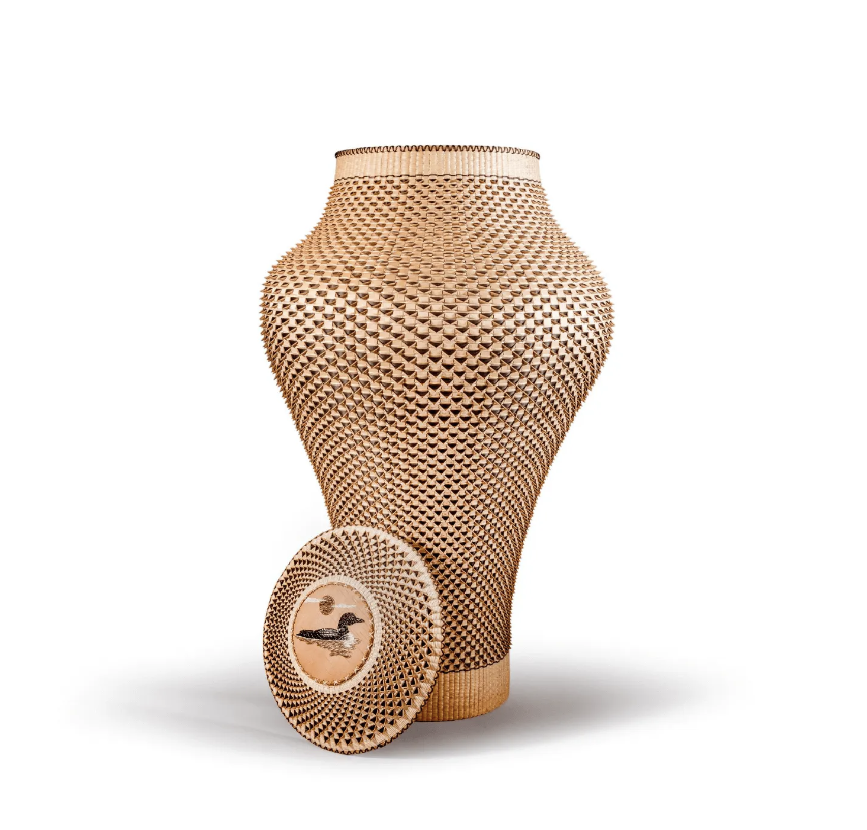 Passamaquoddy artist Jeremy Frey has become one of the most awarded and collected Indigenous basket weavers in the country for his contemporary mastery of the Wabanaki weaving tradition. Intricately foraged and woven from fine strands of ash, cedar, and birch bark with porcupine quills and sweetgrass, the tradition has been stewarded for thousands of years by Northeast tribes—particularly the Passamaquoddy, Penobscot, Maliseet, and Mi’kmac. Frey, who originally learned from his mother, has been instrumental in innovating upon the ancient tradition and bringing the practice into the global contemporary art world. In 2023, the artist became represented by New York gallery Karma. His baskets take on sumptuous forms, sometimes resembling sea urchins or featuring embroidered imagery on the lids. At the Portland Museum of Art, the exhibition featuring more than fifty baskets is the first museum retrospective of a Wabanaki artist.