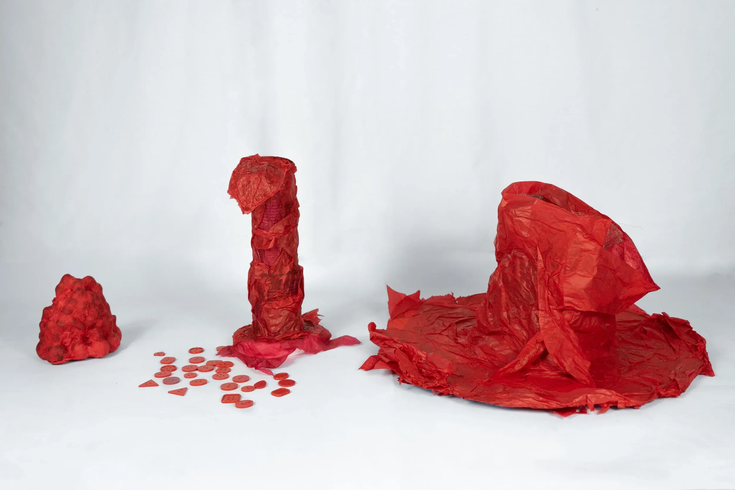 Materials: Wires, red tissue paper, wooden circle spheres, cans, and red buttons