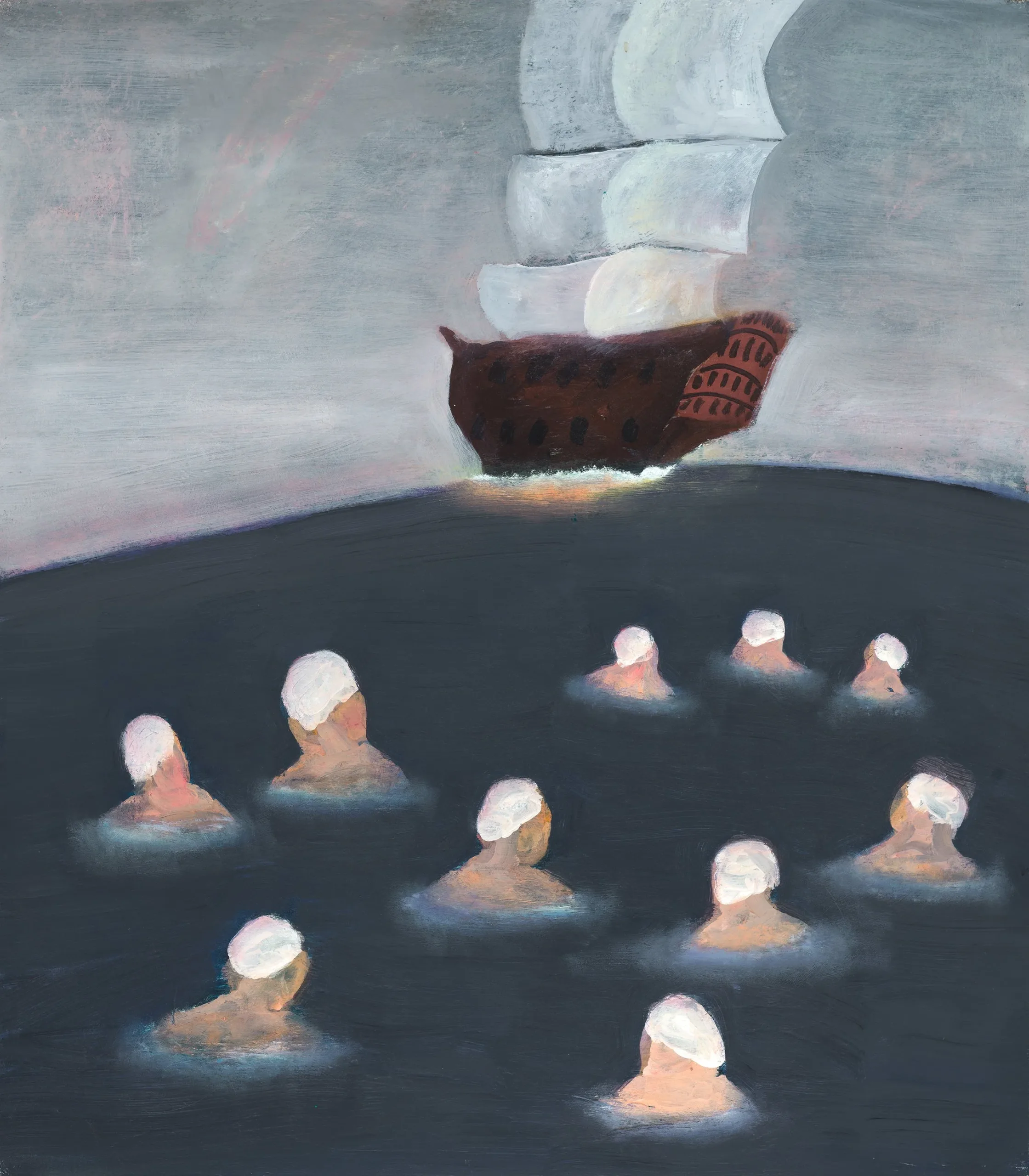 The paintings of Katherine Bradford offer themselves like scenes from a dream, vivid and immediate even as their meaning remains mysterious. Fluorescent nude men ring a pool suspended among the stars. Disembodied legs wearing dress shoes encroach on a green-haired woman’s personal space. A group of sea swimmers gaze out at lightning on the horizon. “Sometimes I do a painting,” says Bradford, who splits her time between Brooklyn and coastal Maine, “and then I make it darker, and then darker and then darker. It’s because I like the mystery. I like things that happen at night.” Bradford has been painting since the 1970s, but her turn to figuration in the ’90s serves as the starting point for the first solo survey of her work, now at the Portland Museum of Art in Maine. Across more than 40 paintings, the show traces her technical evolution — from single subjects to ensembles, from oils to acrylics — as she returns to what she calls her “bag of tricks”: swimmers, caped superheroes, floating horizontal bodies. The artist is drawn to these avatars of fear and uncertainty, she says, because “it’s the opposite of those old stately portraits of royalty, where they’re supposed to look invincible. I like to do people who are slightly falling apart.” “Flying Woman: The Paintings of Katherine Bradford” is on view through Sept. 11, portlandmuseum.org.
