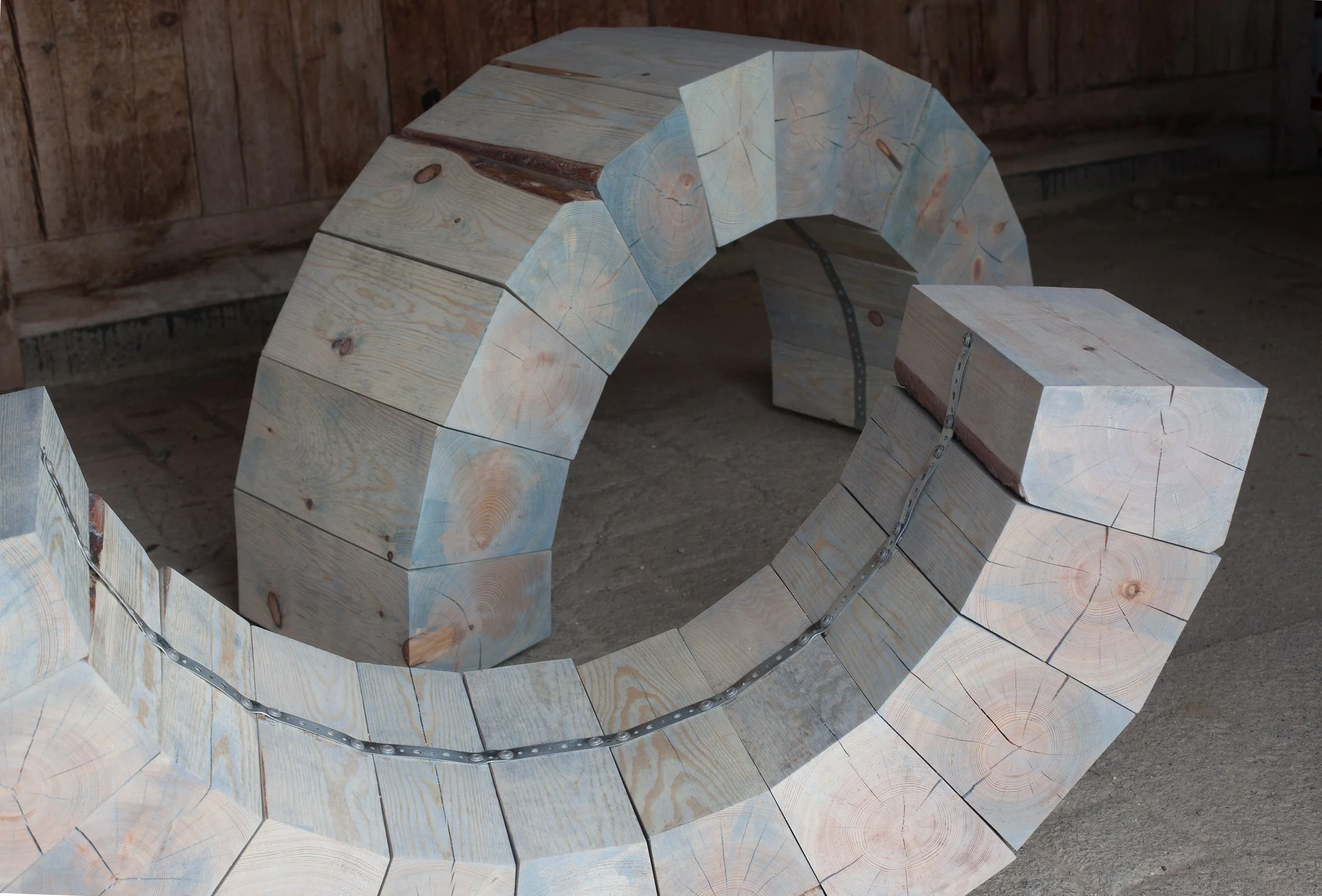 The new installation Arch, developed for this exhibition, is an exploration of how to trace time within our biological structures, specifically the spine. The artists believe the shift to bipedalism introduced traumas into our bodies, such as back pain, neuroses, diseases, poor digestion, and so on. Arch addresses the trauma carried in our bodies because of human evolution and will evolve as a performance throughout the exhibition series.