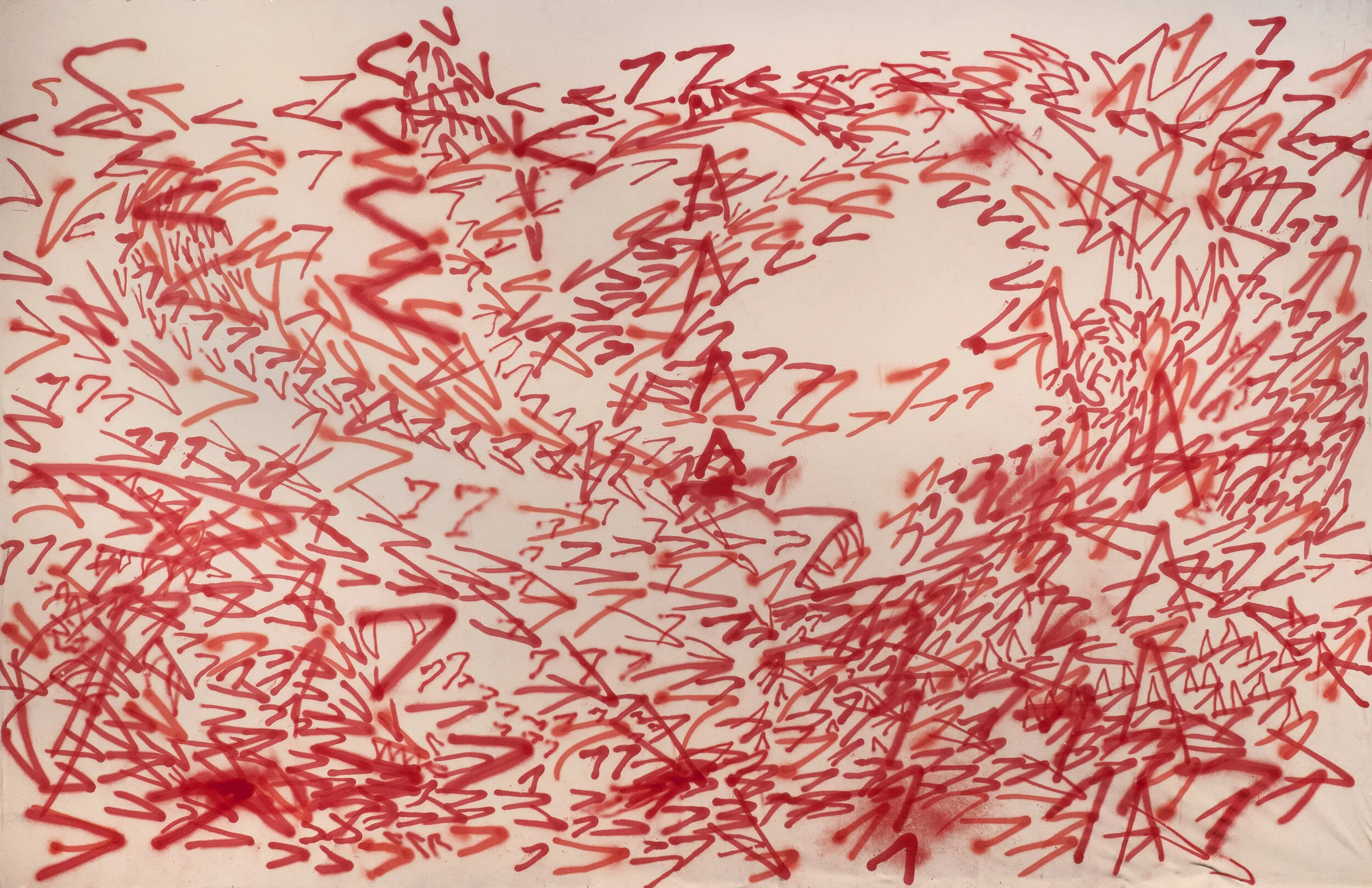 In the painting on view, the number 77 emerges out of spontaneous, red marks. The marks are layered and repeated, creating an energized field of paint and surface, where spray and meaning blur. Austin believes in a number’s potential symbolism and spiritual connotations to others. When a number comes to embody a person, that person’s spirit can manifest anywhere numbers are present. This painting, 77, recalls this experience and speaks about the capacity of numbers to tenderly represent and memorialize a person.