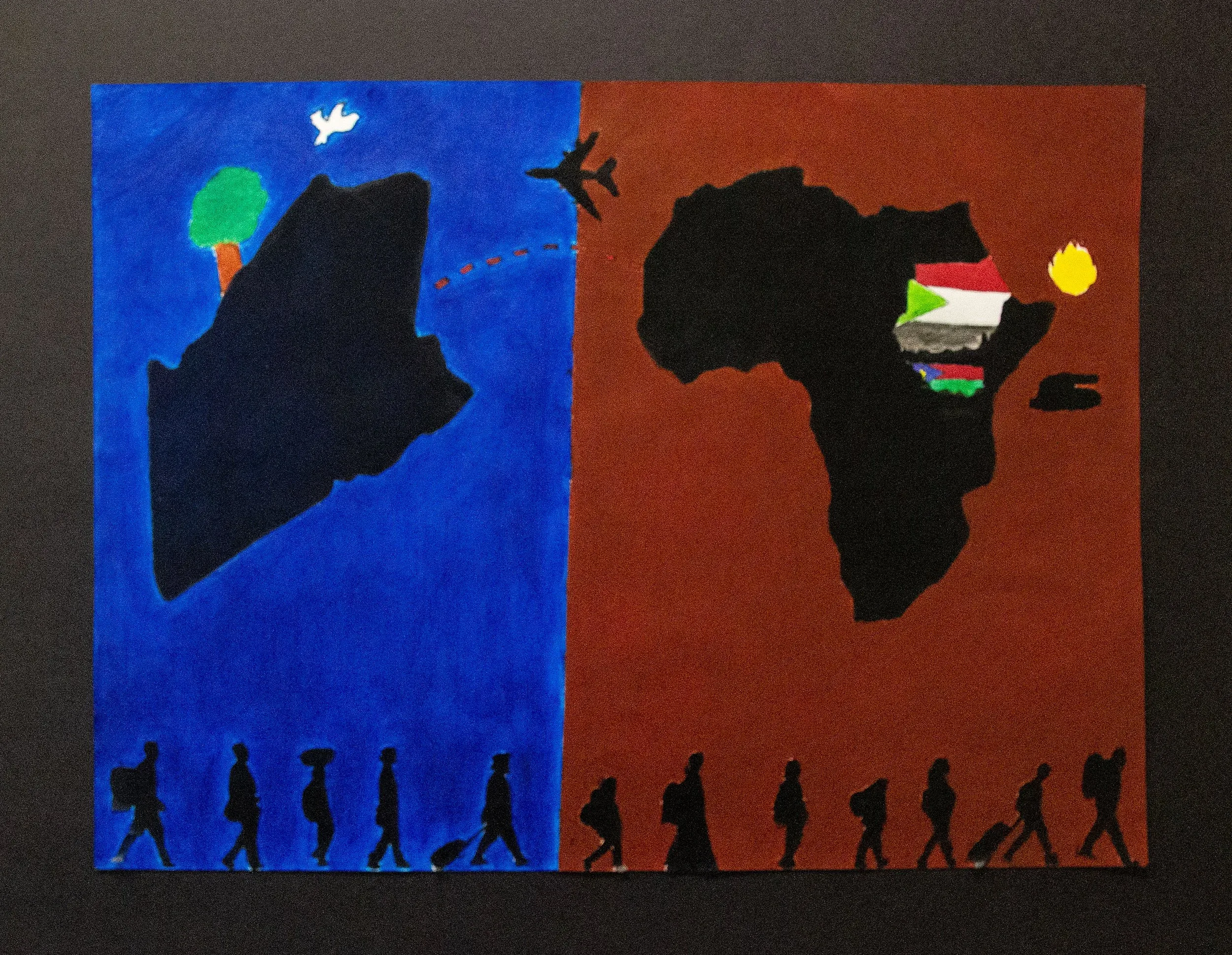 My artwork represents Immigration from South Sudan to America due to war and violence. It also represents how different life is in America compared to how people live in South Sudan.