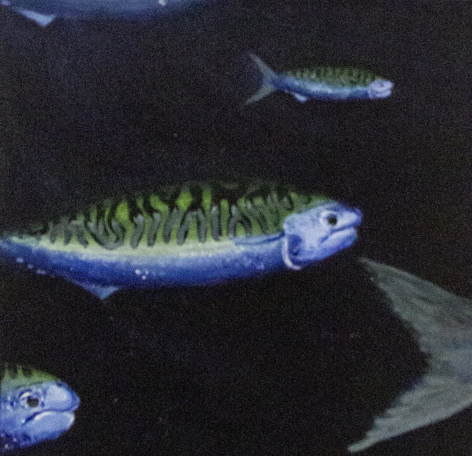 Clay sharks follow migration lines north on the painted map, depicting sharks migrating into colder water due to rising sea temperatures.