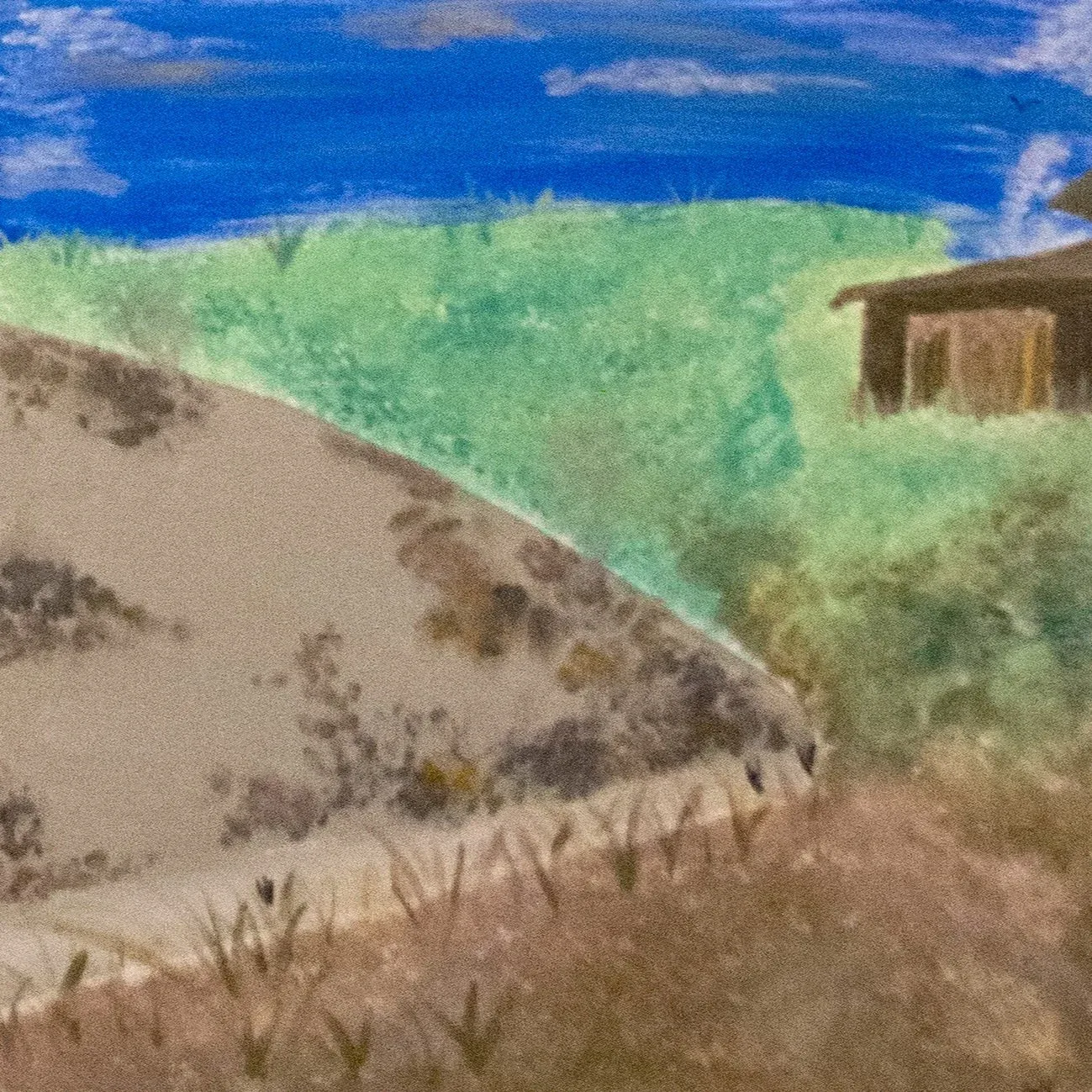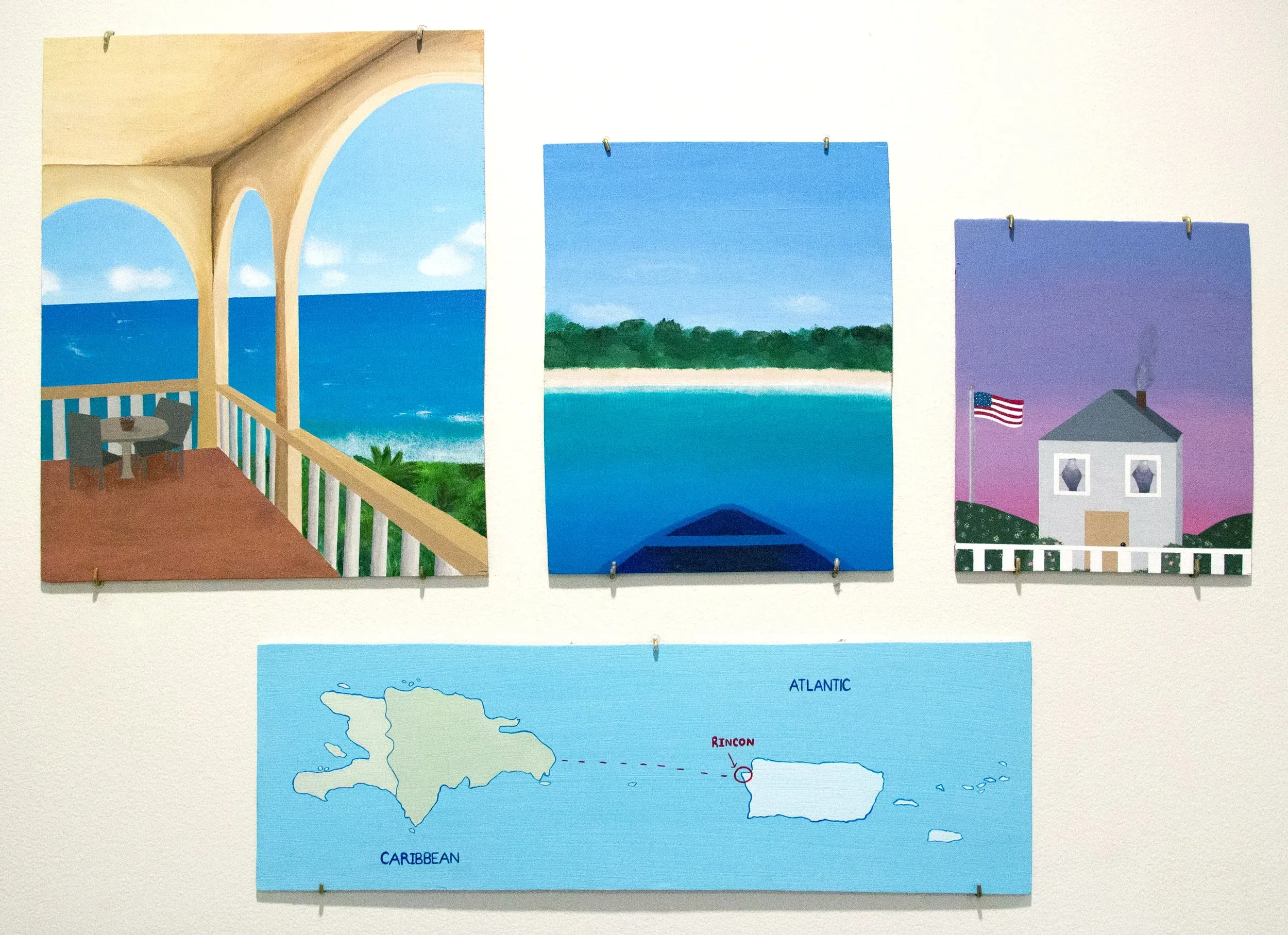 The first painting is the view from the porch of a vacation home in Rincon, Puerto Rico, looking out at the vast ocean. This viewpoint represents someone like me who admires the beauty of Puerto Rico and cannot relate to the hardships and obstacles that immigrants face crossing the ocean. The second painting is the view from a person on a yola, a small make-shift boat, who has left everything behind and risked their life in hopes of creating a better one in America. Many people from the Dominican Republic and Haiti travel over 200 miles through rough seas, taking approximately a total of three days. Those who are lucky enough to reach sand in Rincon, must then make it to the forest to be permitted to stay. If not, they are deported back to their place of origin. The third painting captures the picturesque, stereotypical life of an American. This fantasy is portrayed like a dream to allude to and exaggerate the idea of the “American dream”. The final painting is a map of the Dominican Republic and Haiti in proximity to Rincon, Puerto Rico.