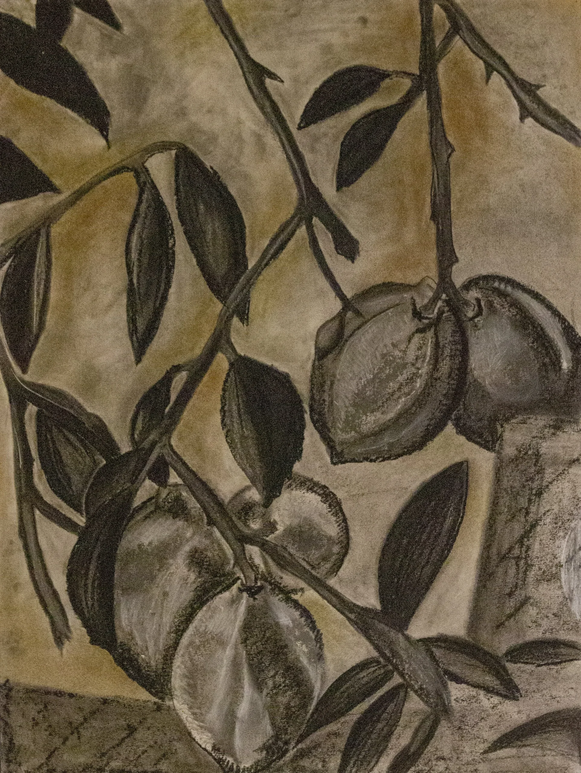 First is a charcoal drawing of lemons on a tree branch. Second, I created four lemons using clay to resemble my 3 brothers and I. Lemons are my theme due to the short story I wrote.