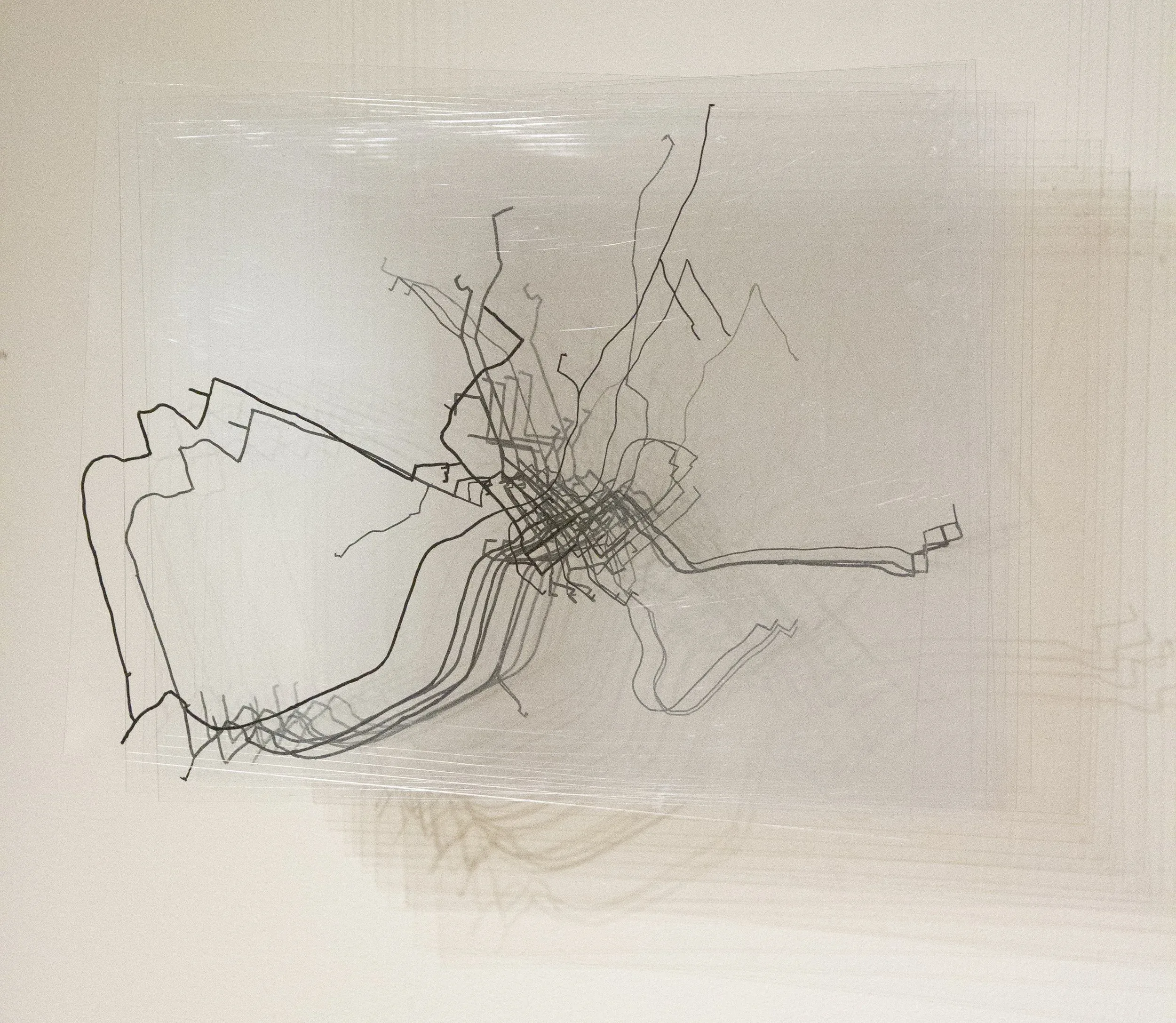There are nine sheets of plexiglass, each one representing a year of my life since moving to Maine at age 8. My house forms a consistent point on the map with routes moving outwards. The width of the lines indicate the frequency that a route has been traveled.