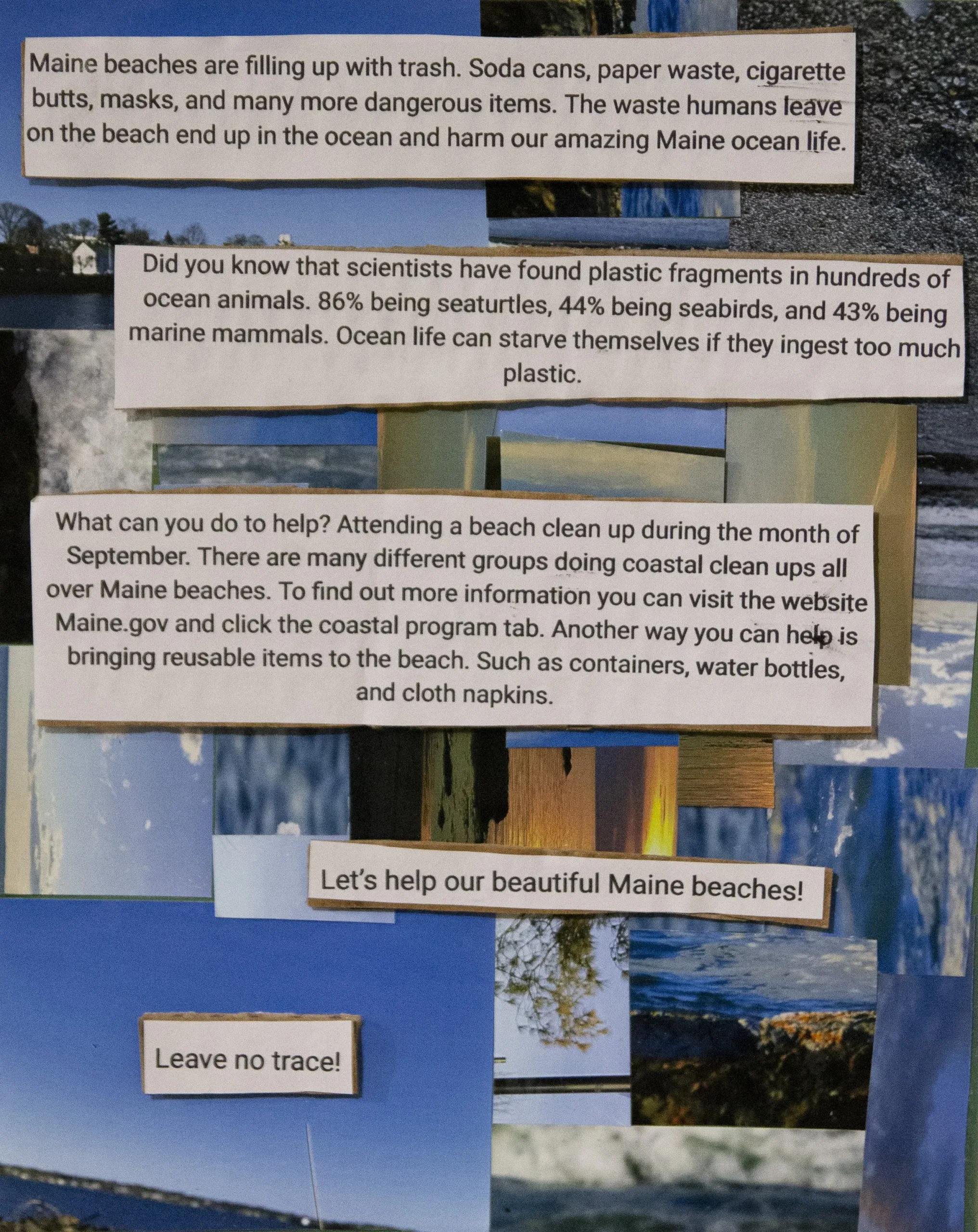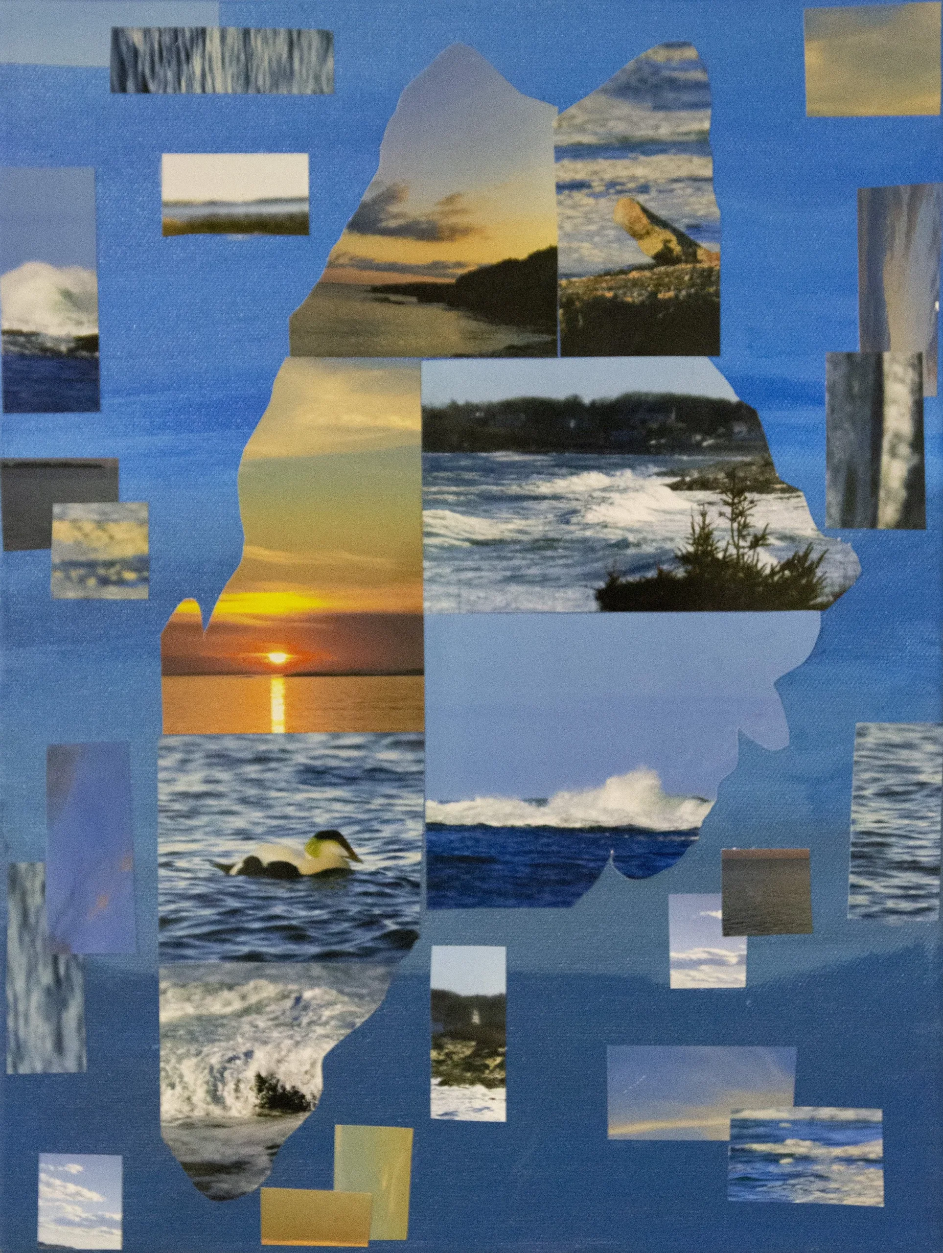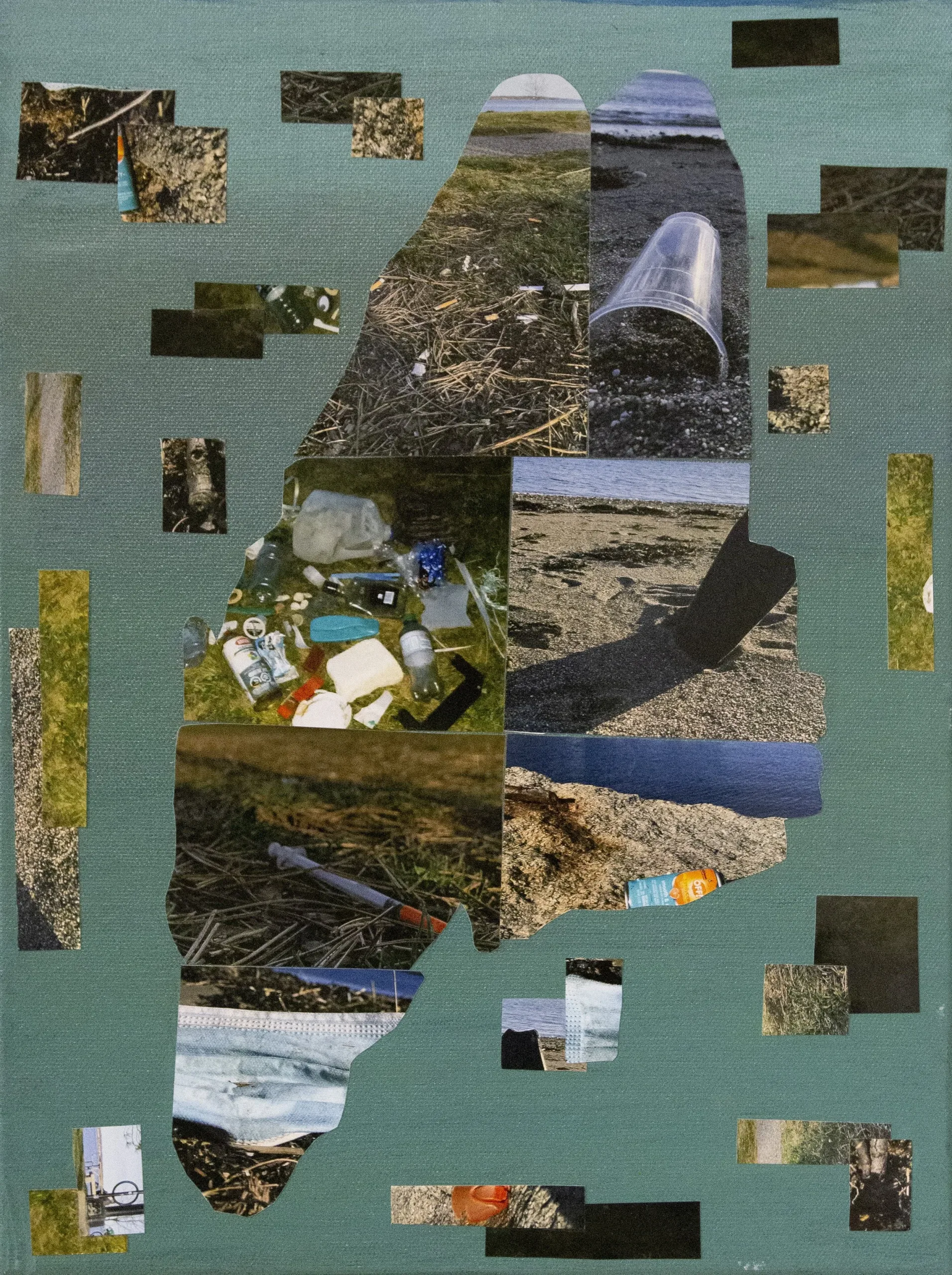 The tourist gaze refers to the idea of a tourist way of seeing places. Maine is known for our gorgeous beaches. However, our beaches aren’t so perfect. My work represents the expectation of a tourist traveling to Maine and going to the beach (blue canvas). Versus the reality of our beaches (green canvas). For many years trash has found its way onto our beaches. I took many trips to the beach and took many photos of all the trash I saw.
