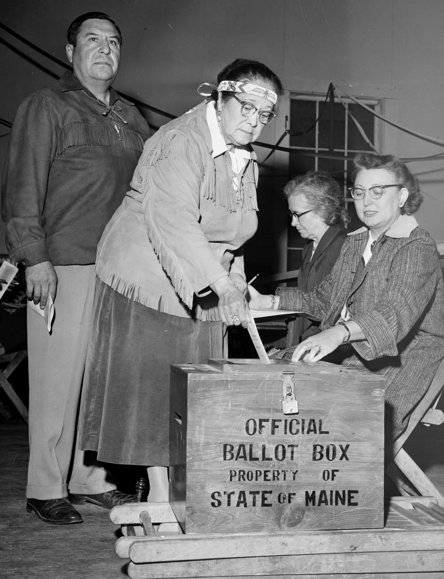 “This photograph appeared in the Bangor Daily News on September 13, 1955, showing Lucy Nicolar Poolaw casting a vote in a federal election. The caption below reads, “Indians vote for first time – Princess Watawaso (Lucy Nicolar Poolaw) of the Penobscot Indian Tribe at Old Town casts the first vote as an Indian on a reservation in Maine.” This vote was the culmination of events crafted by Lucy, her sister Florence Nicolar Shay, sister-in-law Pauline Shay, and Charles Norman Shay.
