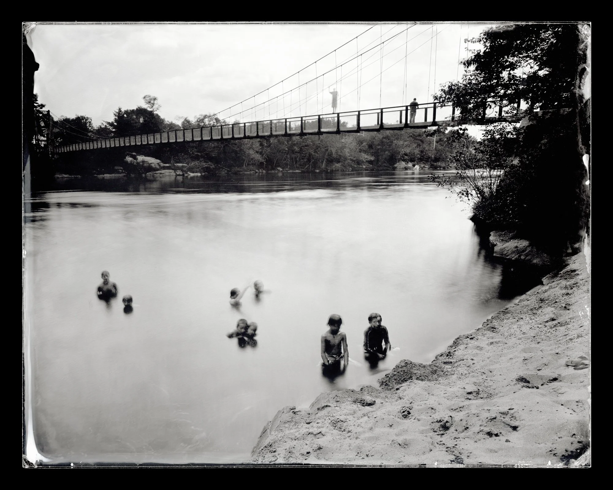 Michael Kolster’s (born 1963) Take Me to the River series, supported by a prestigious Guggenheim Fellowship, documents four “unsung” American river ways—the Androscoggin, Schuylkill, James, and Savannah—to visualize their ecological transformations since the passage of the Clean Water Act of 1972. His pictures demonstrate how waters and shores once made uninhabitable by rampant pollution have emerged from centuries of industrial abuse and neglect. Using the ambrotype process, which necessitates a glass plate negative and requires a prolonged exposure time, Kolster firmly situates his work within the history of photography. In Swimmers, Swinging Bridge, Topsham, Maine, 2012, the long exposure time is apparent in the blurred figures in the water, the seeming soft surface of the moving river, and the faint figures on the bridge. Yet the sand in the lower right foreground, which would have remained perfectly still, is captured with the utmost clarity.