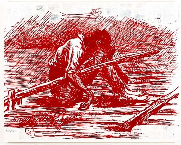 Pairing book pages with painted imagery forms the core of the group’s practice. They have recently used text from Shakespeare’s A Midsummer Night’s Dream, Dracula by Bram Stoker, The Scarlet Letter by Nathaniel Hawthorne, writings by Martin Luther King, Jr., and On the Origin of Species by Charles Darwin. Adventures of Huckleberry Finn—Asleep on the Raft (after Mark Twain) depicts the character Jim from the classic 1884 American novel. Huck Finn’s companion in adventure sits on a raft, his weary arms resting on his knees. The background is formed by a collage of pages ripped from a copy of the book, beginning with the text that corresponds to the scene that the painting portrays, and pasted onto the canvas in an orderly, sequential grid. The painted composition layered above is the artists’ re-creation of E. W. Kemble’s illustration from the first edition of Twain’s book. When speaking about the group’s works inspired by the novel, Rollins connected this image to racial equality and historic oppression of African Americans: “It doesn’t matter what you look like.… We’re on the raft together. We need each other to survive.” The subtly distorted treatment of Jim’s figure alludes to the racism of the late nineteenth century, while also prompting questions about American history, appropriation, literature, and the nature of illustration