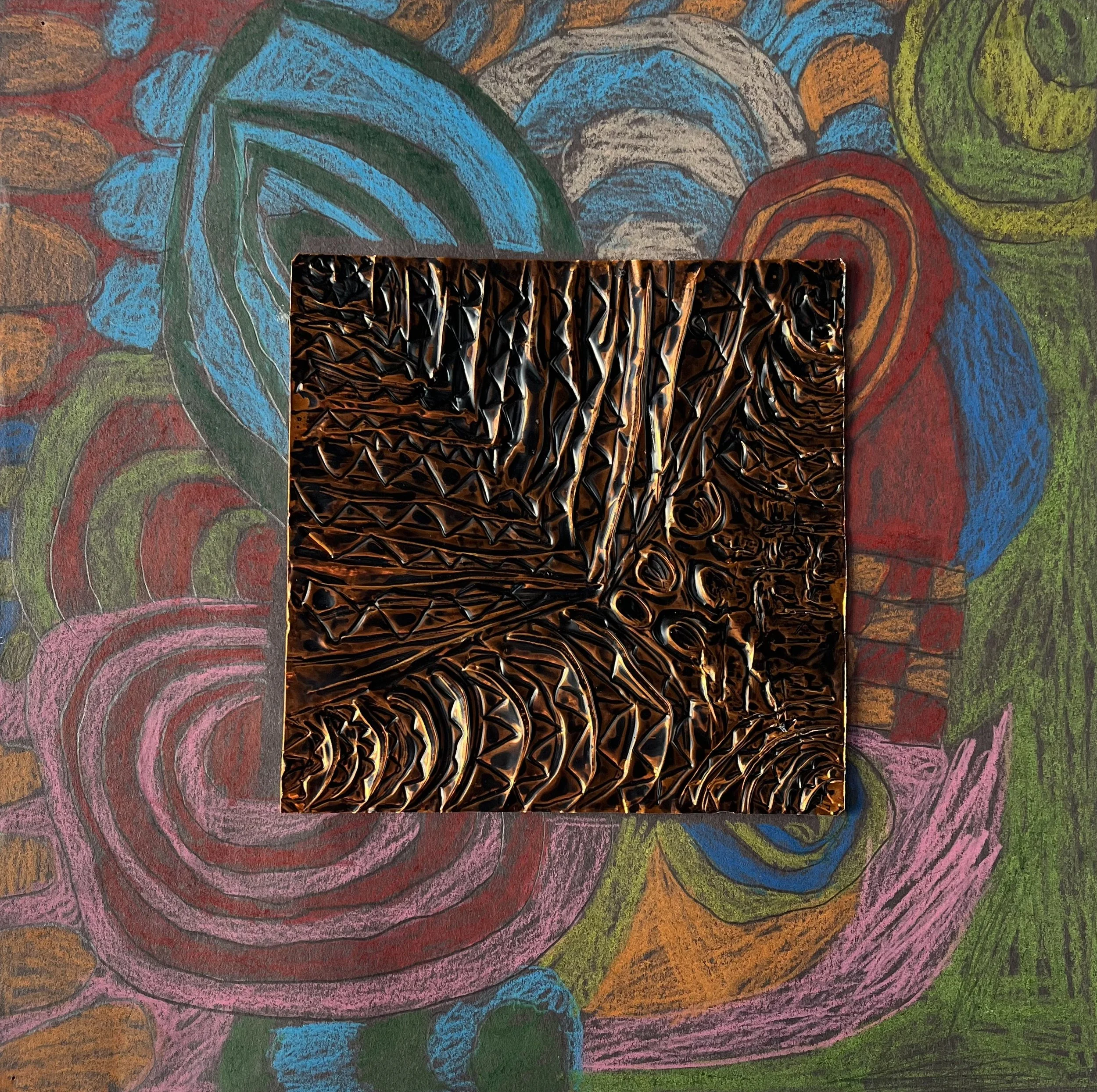 “I used metal tooling techniques to emboss into both sides of a piece of metal foil, stretching and raising the metal and indenting it back in. Then I painted the foil with India ink and burnished some of the ink off after it had dried. Next I used colored pencil to expand the shapes that I had pressed into the foil out into the border of black paper. I tried to show unity between the foil square and the black paper so it looks like the patterns expand out.”