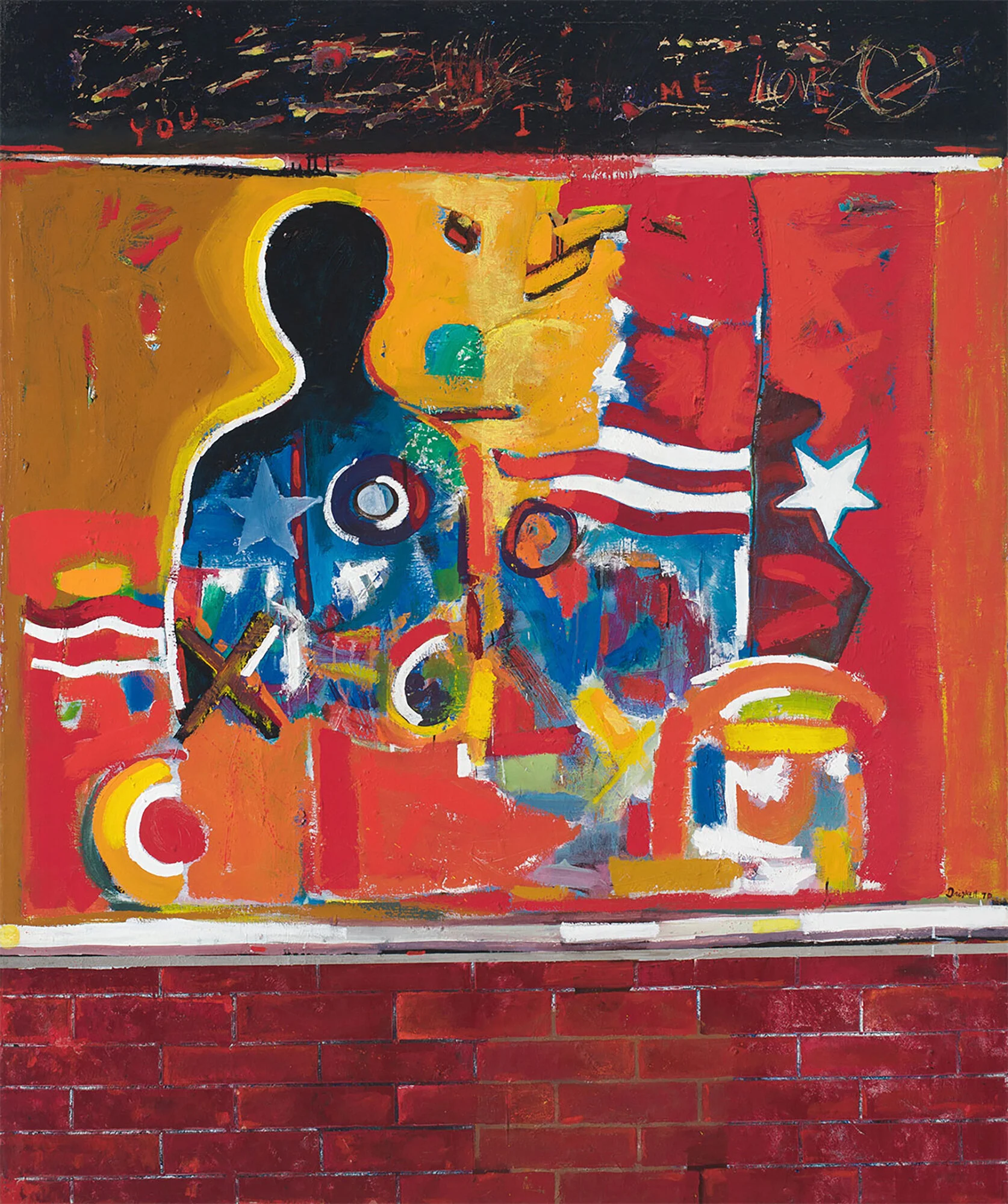 Driskell also recorded his state of mind during the Civil Rights movement in his art. “Masking Myself” (1972) is a magnificently complex drawing that accurately describes the need to not fully reveal yourself as a Black man in America. It’s impossible to imagine that the book incorporated into the mixed-media “Black Ghetto” (1968–70) isn’t very intentionally open to a chapter called “Purchasing Agent” where we glean a subheading that includes the words “Not Essential.” Conversely, “Ghetto Wall #2” (1970) is more optimistic. The American flag’s stars and stripes are deconstructed and exploded across the brightly colored canvas, implying crumbling of myths and status quo. Across the top are the words “You I Me Love.”